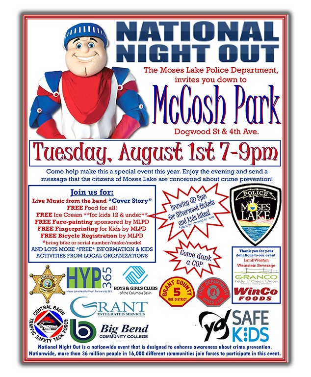 Moses Lake: National Night Out, Tues. Aug. 1, 7-9 p.m., McCosh Park Moses Lake via Grant County Sheriff Department